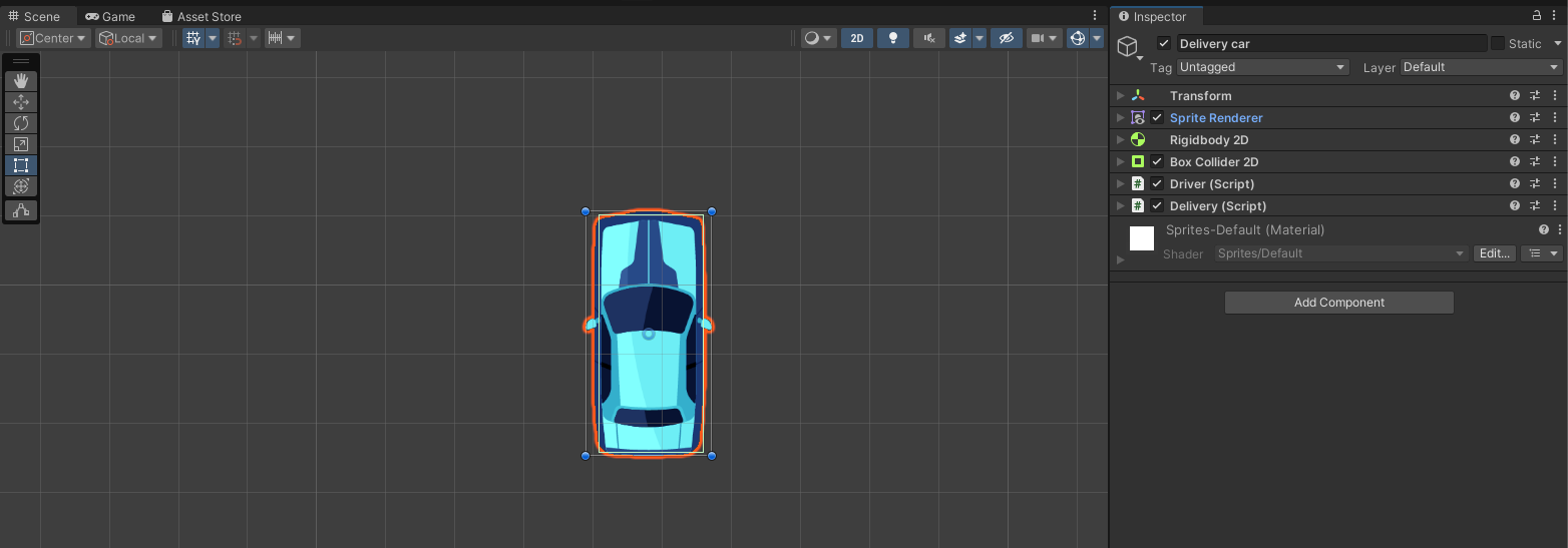 Component : Transform, Sprite Renderer, Rigidbody 2D, Box Collider 2D, Driver(Script), Delivery(Script)