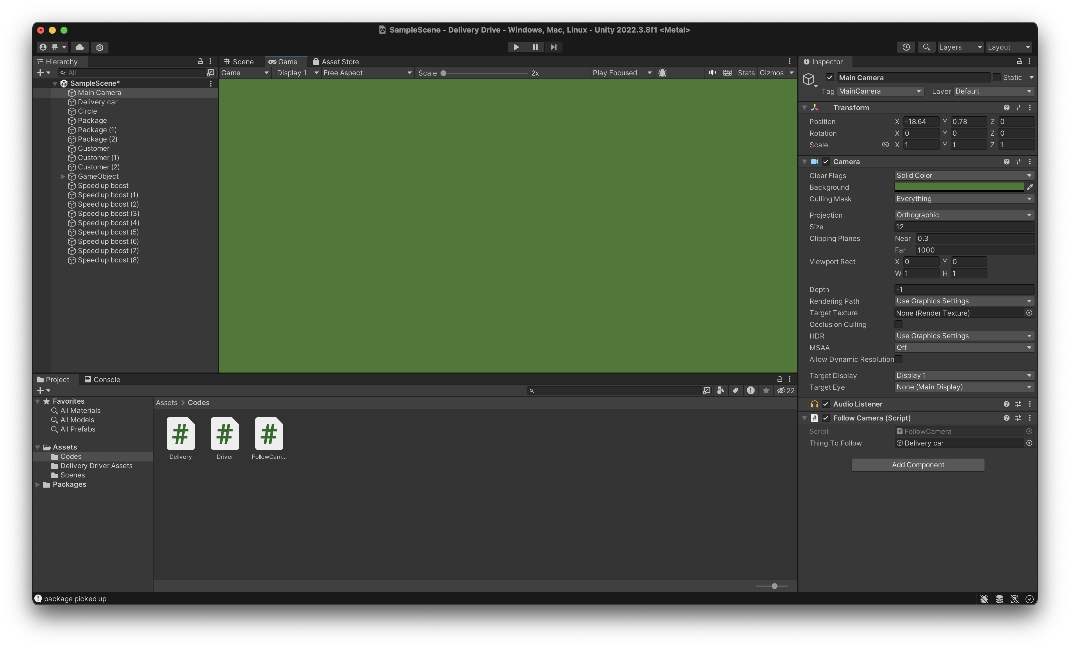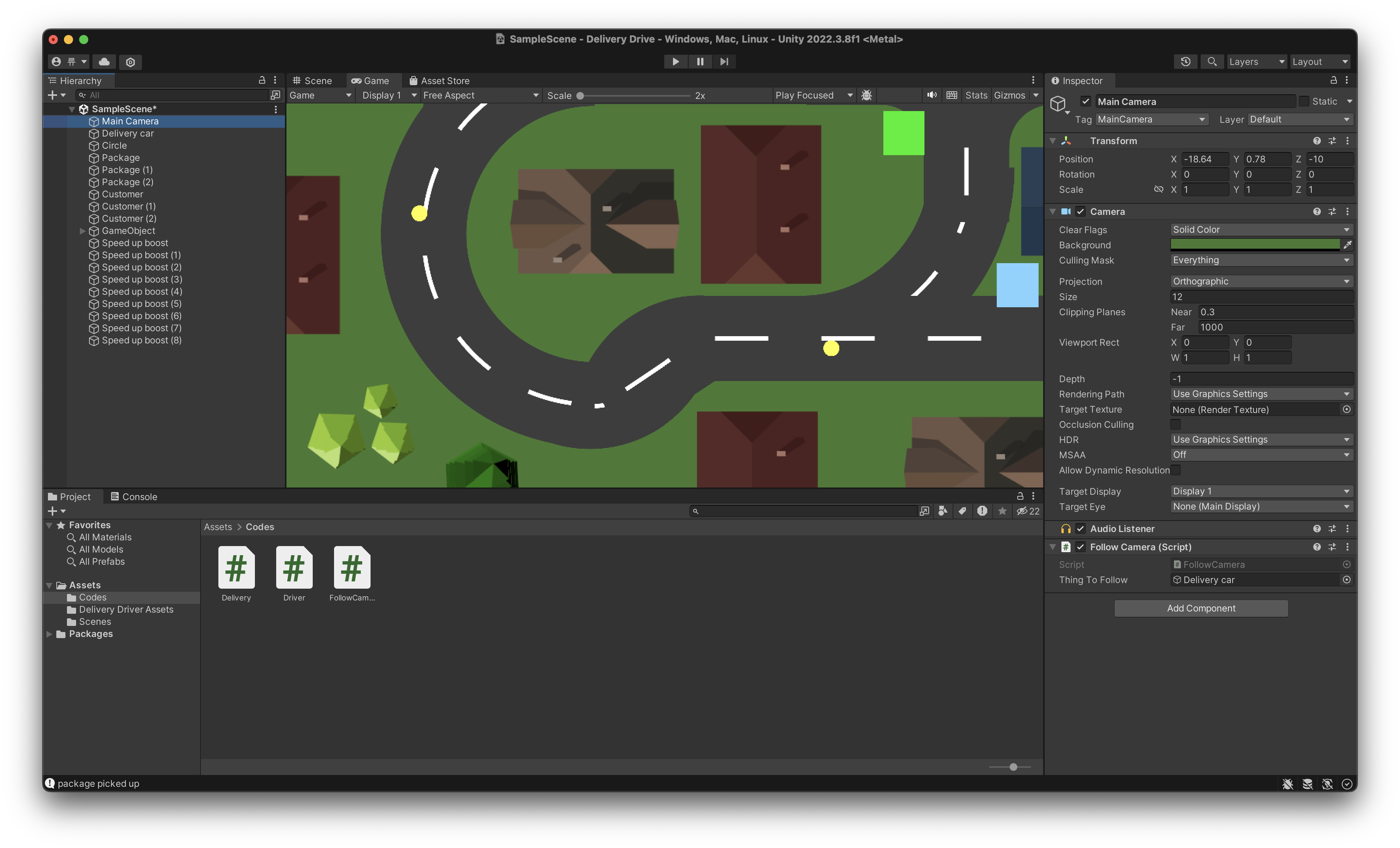 Tag : Untagged Component : Transform, Sprite Renderer, Rigidbody 2D, Box Collider 2D, Driver(Script), Delivery(Script) Rigidbody 2D : Gravity Scale를 0 변경하여 조작하지 않아도 중력에 의해 떨어지지 않도록 하였다 Driver(Script) :