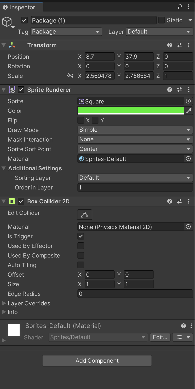Box Collider 2D 컴포넌트를 Is Trigger를 활성화하여 해당 스프라이트 오브젝트에 추가하여 캐릭터와 충돌을 감지했습니다.