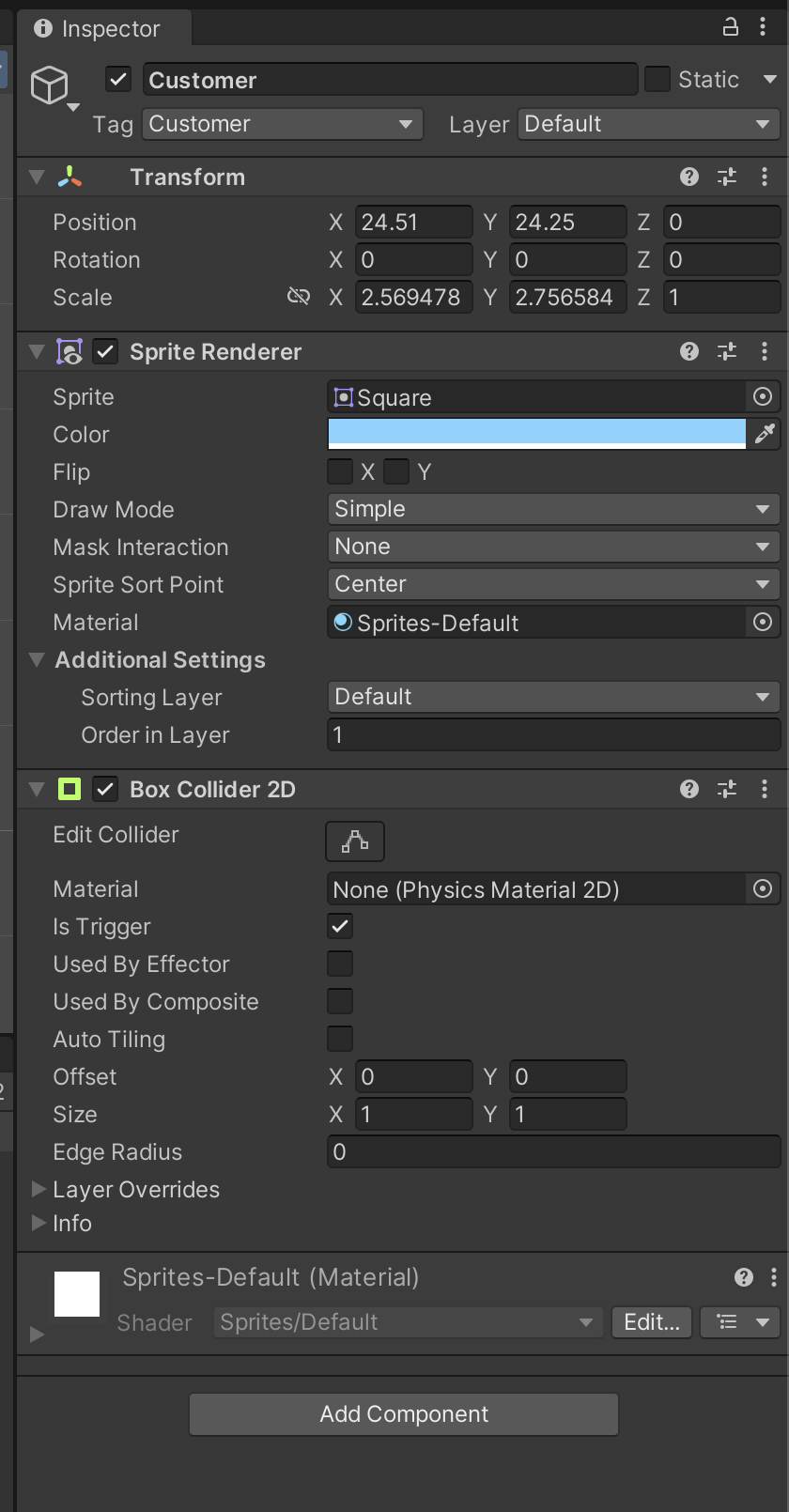 cirecle Collider 2D 컴포넌트를 Is Trigger를 활성화하여 해당 스프라이트 오브젝트에 추가하여 캐릭터와 충돌을 감지했습니다.